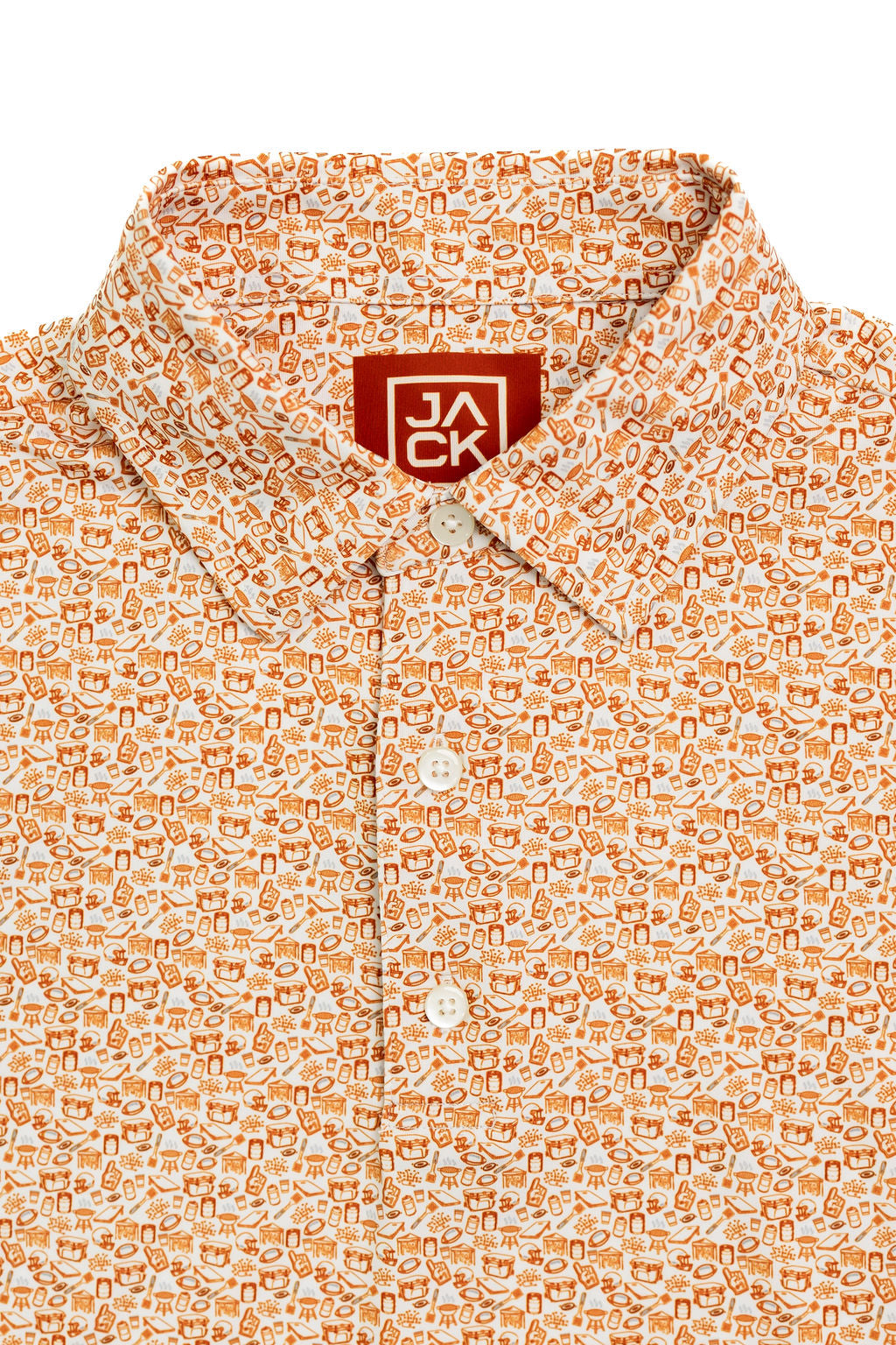 This Burnt Orange football-inspired polo stands out with a clean white base that provides the perfect canvas for a bold splash of purple accents. Across the shirt, dynamic football motifs bring energy and passion to the design — from detailed football helmets and goalposts to laces and football patterns subtly woven into the fabric.